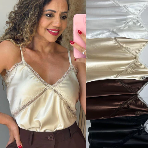 Blusa Regata Decote em V com Renda Cetim Ariane