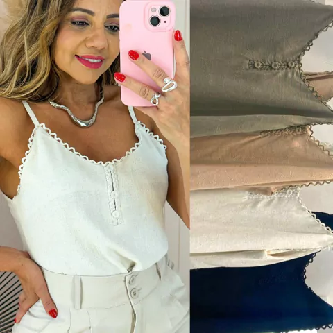 Alças finas com regulagem, modelo com detalhes em renda, botões e trançado