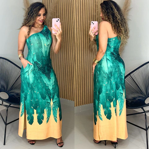 Nosso Vestido Anita é a peça ideal para quem busca sofisticação sem abrir mão de um visual marcante. Com modelagem longa, decote nula manga e uma linda estampa de folhagens, ele alonga a silhueta e cria um visual fluido e elegante. Sua estampa folhagem em tons de verde e bege traz um ar sofisticado e tropical, ideal para quem ama peças que unem frescor e estilo.