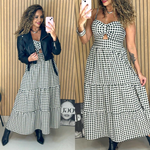 Vestido Midi Alças Recorte Busto Elda Xadrez
