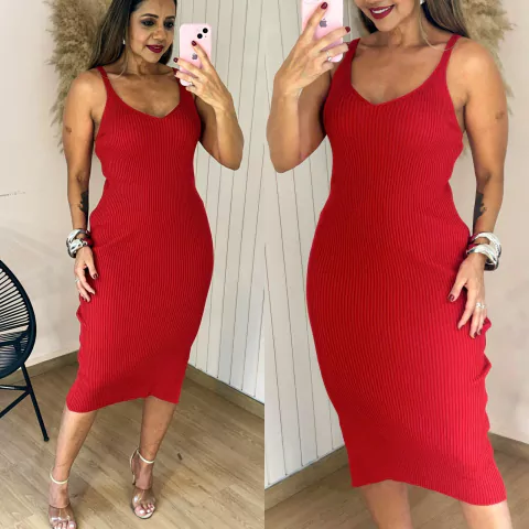 Vestido Tricot Midi Canelado Alças Gisele Vermelho